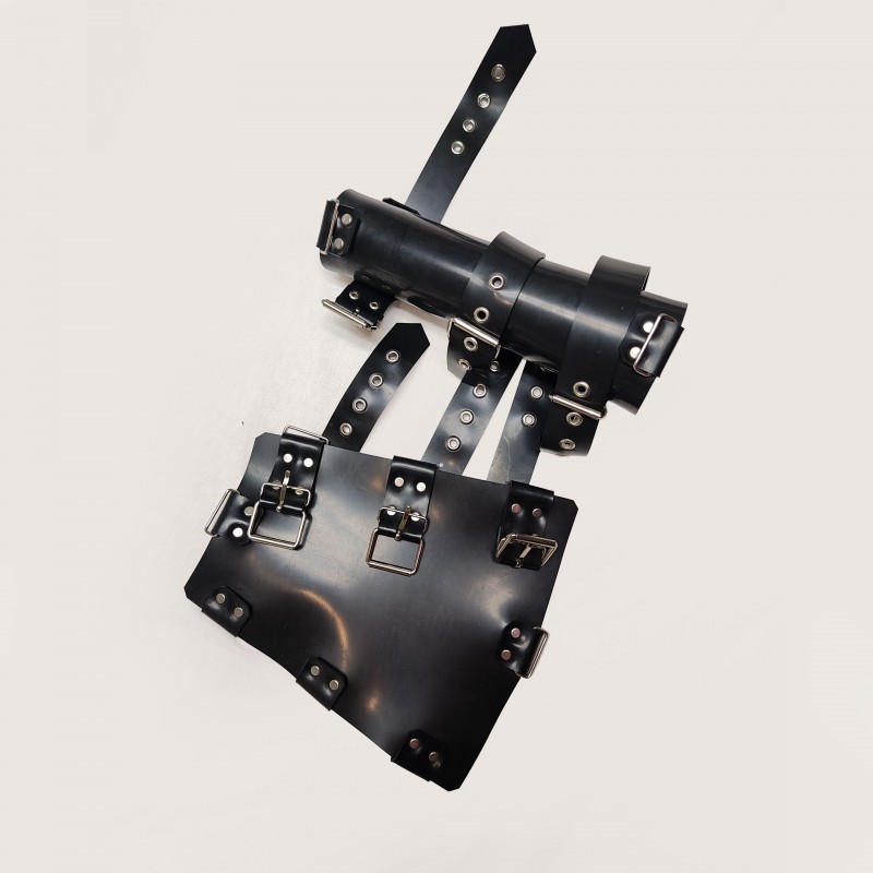 Solid rubber fetish brace with three buckles for tightening.
